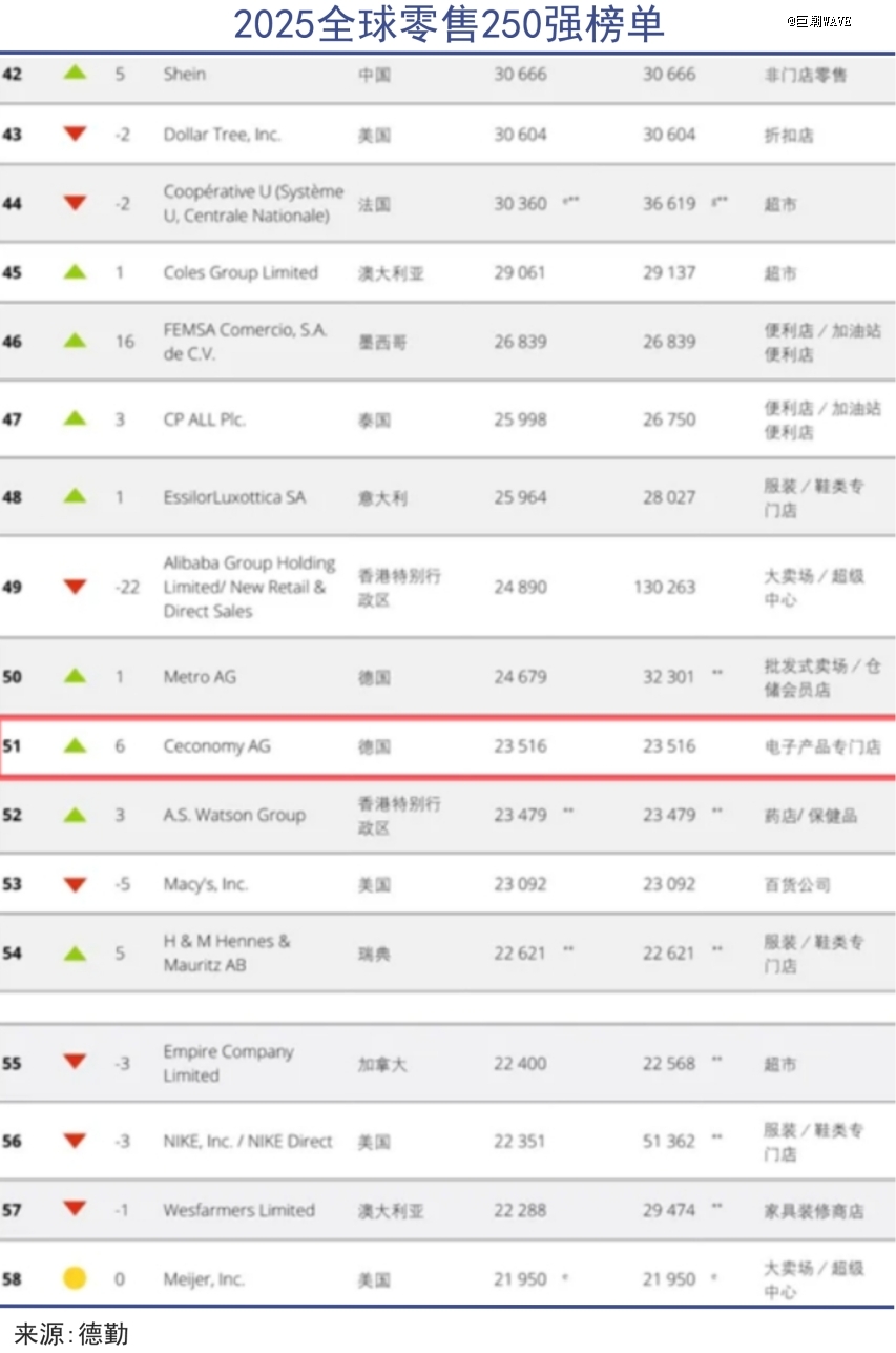 ceconomy是欧洲最 大消费电子连锁集团,旗下拥有mediamarkt和saturn两大品牌,在欧洲11国运营了超千家门店。根据德勤发布的《2025全球零售力量》研究报告,ceconomy以240亿美元营收排名全球51位。