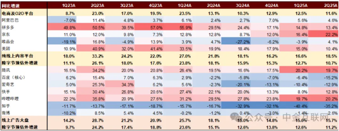 中金数据显示,25q2整体线上广告大盘同增15.7%,抛开字节跳动广告增速、电商及o2o广告增速,线上内容广告大盘增速为10.7%,相对一季度略有降速。